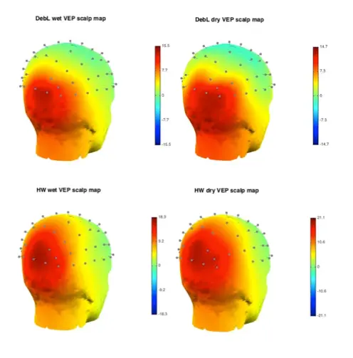 Figure 6: VEP topography in two typical patients using gelled (left) and dry (right) electrodes.